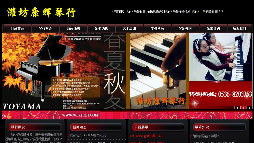 濰坊康輝琴行是一所大型樂器銷售及樂器培訓的專業機構。樂器質量上乘,價格公正,是鋼琴,管樂,民樂綜合一體的大型樂器 專賣店。主要經營托雅瑪(TOYAMA),威廉·斯坦伯格,皇冠,珠江 等國內國外著名鋼琴,托雅瑪(TOYAMA)雅馬哈(YAMAHA)原裝進口 薩克斯,波鷹手工單板吉他,另有各類民樂,從售前,售中,售后 力求做到更加專業。培訓方面:本中心500平米,琴房10間,排練廳 ,舞蹈房。提供免費試學,免費練琴,免費輔導等優惠政策。教師 隊伍專業化,組織學員參加各類比賽與演出活動,定期舉辦音樂會 ,學生多次在比賽中取得優異成績。