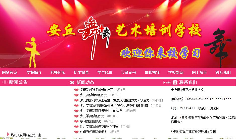 09、10年該基地少兒舞班,拉丁舞班分別榮獲國內各類舞蹈大賽一、二等獎,并連年應邀參加我市電視臺春節聯歡晚會等大型演出活動,校長在該活動中擔任舞蹈編導,所演節目受到市委、市府領導的一致肯定。07年8月臺灣土風舞蹈團團長魏淑靖教授應邀來我校指導教學。09年8月特邀文化部優秀專家、博士生導師劉俊驤教授來我校指導教學。10年我校藝術高考生取得了可喜的成績,分別通過了北京電影學院、寧夏大學、延邊大學、西南民族大學、長江師范大學、山東師范大學、濰坊學院等高等院校的專業考試,是該基地高考學員專業合格率達100%。09年該校被山東電視臺評為特邀誠信單位,同年校長被評為濰坊市技術能手榮譽稱號。