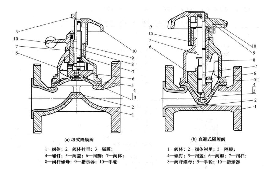 直通式隔膜閥:閥體內部似直管形,閥門全開時介質直流無阻。因此流體阻力小,切斷與流動能力佳,耐腐蝕切能包容顆粒狀介質。缺點是關閉閥門時隔膜行程廠,對隔膜撓性要求較高。